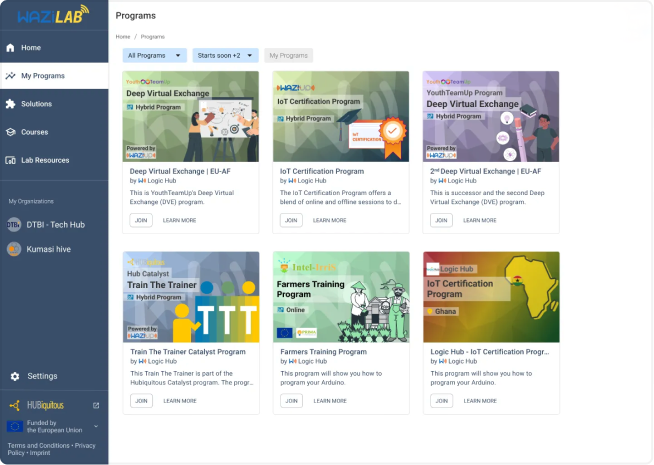 Wazilab unifies learning, innovation, and execution into one platform. Users gain access to hybrid programs, Cutting-Edge AI learning resources, integrated project and organization management tools, and a complete Solution Kit Box for rapid IoT prototyping